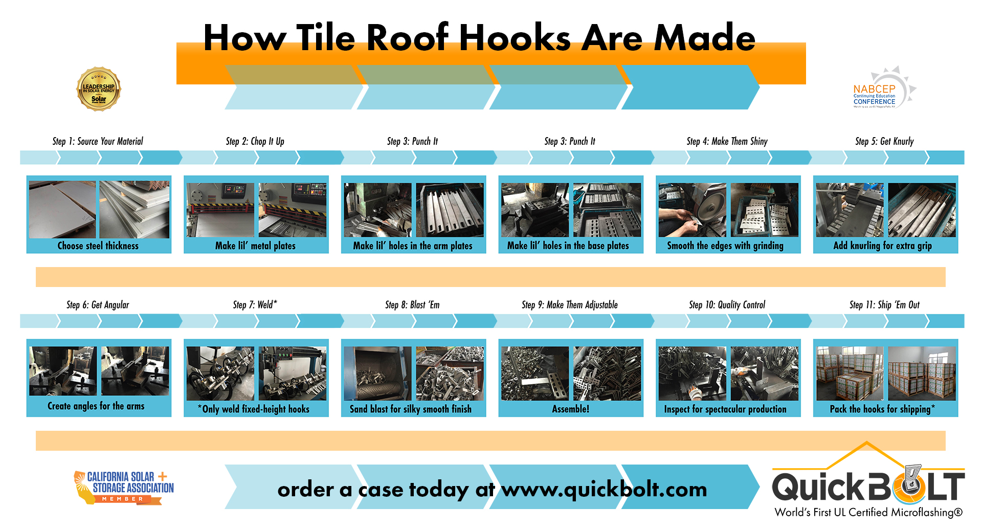 In this article, we'll take you through the ten-step process of producing a solar roof hook! You can view the full infographic above and read about each individual step below.