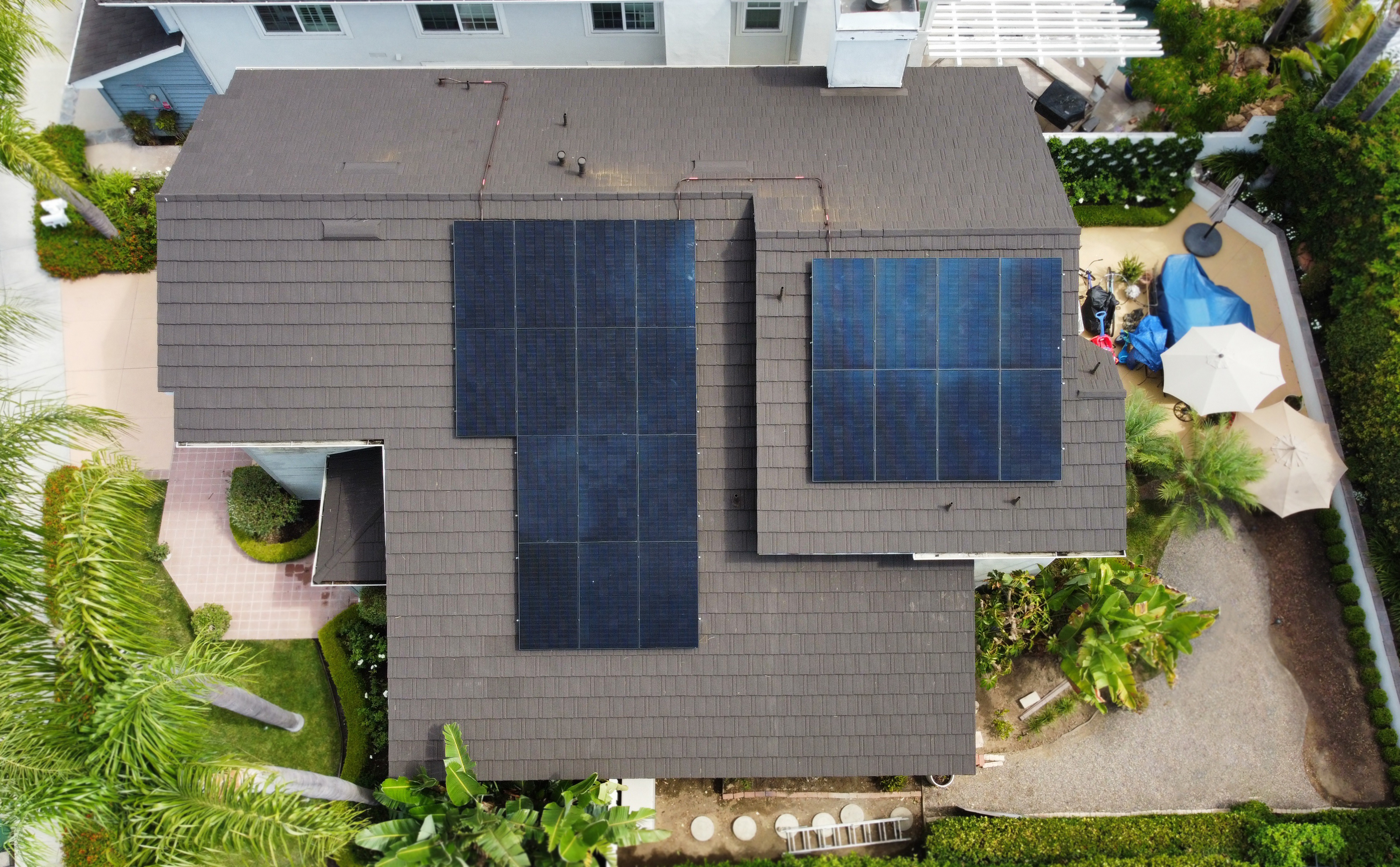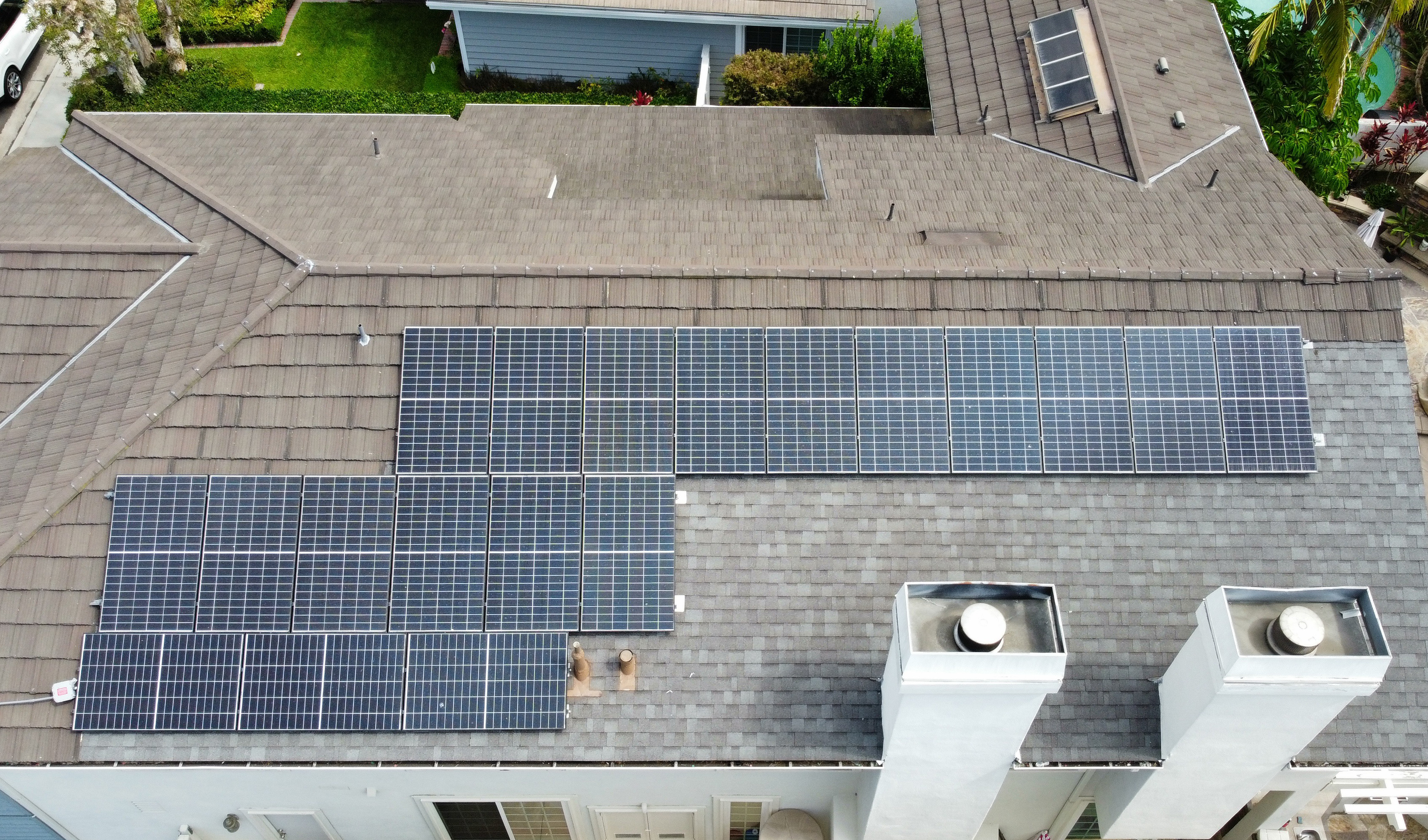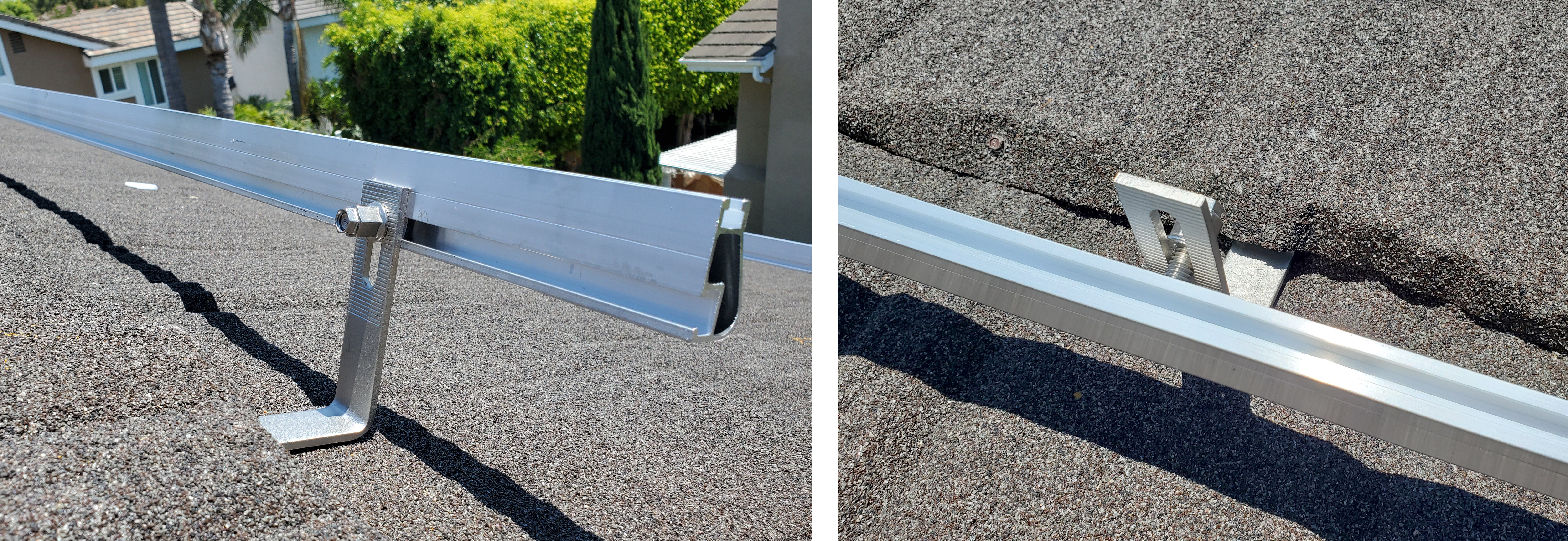 In a lovely twist, we first learned what NOT to do by looking at the house next door, how convenient! Many contractors in today’s market falsely believe that to install solar on a Stone Coated Steel roof they must first remove the stone coated steel and then install asphalt shingles to create a flat area to install the new solar system. See the picture below for an example.